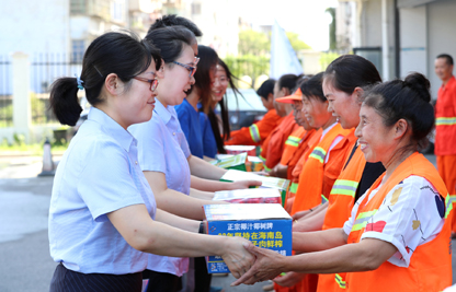 践行社会责任,传递建行温度。近日,浙江省嘉兴分行带着金智惠民暑期实践学子前往新嘉街道慰问“城市美容师”,为他们送去清凉防暑慰问品与关爱之情。■ 叶林/图文