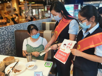 日前,远程智能银行中心南宁分中心组织“张富清党员先锋队”走进餐厅茶肆,宣传“厉行节约,反对浪费”理念,做节约的宣传员。队员通过展示自己制作的“光盘行动”倡议海报向就餐人员宣导节约粮食,鼓励光盘,拒绝“舌尖上的浪费”。■ 朱立曼/文 陈吉/图