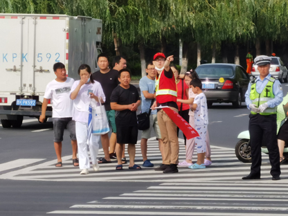 “大爷,别着急,红灯亮了再走!”