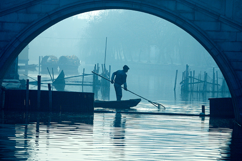 欲把西湖比西子,殊不知东湖也不失风情。绍兴是个水城,湖泊星罗点缀,河道阡陌交通,东湖便是绍兴自然风情的一个缩影。坐上乌篷船,徜徉在青山绿水间,天微阴,风微凉,人相依,风景正好。船夫穿着长袍,带着毡帽,远处搭着社戏的台子。背靠青山,云雾袅袅,舟行绿水,微波潺潺,闭上眼睛静静呼吸,给肺一点滋润,给心一处自然天地。东湖旁边的小山不高,竹林深处,有木质小屋和茶社,人很少,很安静,静得听得到花开,静得忘记了时间。