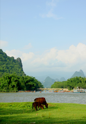 它总是带着惊人的美丽,像在天边,既亲切又遥远,吸引着我一次又一次前行。而乘一叶轻舟,深深呼吸漓江的气息,让缓缓的小船,承载着我,从杨堤到达兴坪。那份悠然遐逸怎能不让我着迷?