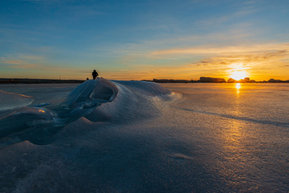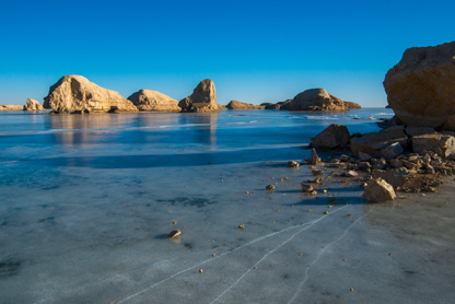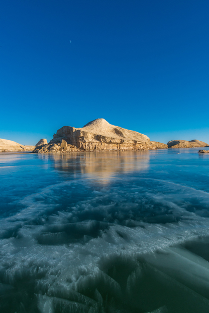 “雅丹”是维吾尔语,意为“具有陡壁的小山包”,也叫“风蚀林”。冬日来到这里,水面变成了冰面,厚厚的冰层中间夹杂着各式各样的冰纹和气泡,仿佛是天然织就的波斯地毯,行走其上,美得让人不忍下脚。而冰面与冰面之间由于张力的挤压作用,又形成了一条条蜿蜒起伏的冰隆,或白如羊脂,或青似翠玉,或粗或细地向四周延伸,恰如敦煌飞天飘逸的丝带。日暮斜辉、日出朝红之下,让本色并不出众的雅丹,顿时浓妆艳抹,这一刻,红蓝色块在这里交错,冷暖色系在这里交融,美不胜收。