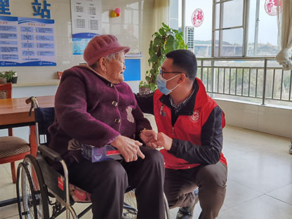 来到曲靖市老年公寓。穿过樱花盛开的逶迤小道,大家在公寓的四楼和五楼,为老人们送上小礼物和诚挚的祝福。青年们与老人一一结对,陪他们聊天、谈心,了解他们的人生经历和在老年公寓的日常生活,大家逐渐亲切起来,“我是东北人,以前在贵州工作,我们那会儿……”“我女儿也是建行的,前几年刚退休,今天看到你们就像见到了亲人……”话匣子打开就停不下来。在真心付出、帮助他人的同时,青年们也从老人那里收获了为人处世的珍贵锦囊。