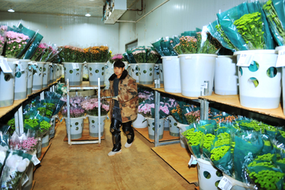 走进天华生物产业有限公司的冷库,传说中的“七彩云菊”果然艳压群芳,由于采用了生物炫彩素,加之特殊的温度、水分、光照控制,如彩虹般绚烂的色彩均匀地呈现在花瓣上。冷库外宽敞的车间里,村民们正在将刚从大棚里采下的菊花分拣、包装。