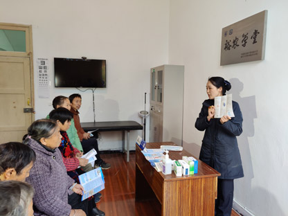 第二天,省分行乡村金融部和开阳支行的志愿者们一起赶往下坝村,卫生室里已坐满了村民,等待着“裕农学堂”开课。