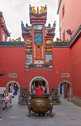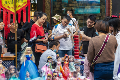 院子中间是一圈民俗手工艺品摊床,捏面人、做糖画、剪纸……内容上却看到与时俱进的变化,芭比娃娃面人、流行语的剪纸、变形金刚工艺品等等,年轻的手艺人一丝不苟地做着每个作品。院子里还有几处拜神的地方,有祭祀火神的,有观音菩萨的等等,还有做臭豆腐的作坊。