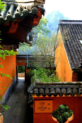 终于到了,国清寺的外围入口处是七座小型石塔,面前是一条清澈的山溪。走过架在山溪上的石拱桥,黄色的寺院墙就在面前,外墙上写着“隋代古刹”四个大字。尽管“隋”字笔划中少了一个“工”字,但这也是国清寺与众不同的景观性标志。细细观察,黄墙上“隋代古刹”四字的中间是一幅圆形腾龙图像,揣摩一下,这应该是皇家文化的缩影与追求。正殿大门上赫然写着“国清寺”三字,主体由大雄宝殿、观音殿、雨花殿等数幢建筑组成。左侧为妙法堂、三贤殿、鱼乐国等佛堂。寺院曲径通幽,绿植茂盛。听领队介绍:寺院初名“天台寺”,后崇尚国泰民安,取“寺若成,国即清”之意,改名为国清寺。寺内除了传统的四大金刚、十八罗汉等常规布局外,还保存了大量的摩崖、碑刻、手书、佛像和法器等珍贵文物。