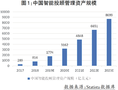 随着中国财富管理市场的发展,监管政策的放开,居民可投资资产的增加,以及大数据、人工智能等技术的进步,近年来,中国智能投顾市场规模有了长足发展,预计2023年资产规模可达8699亿美元。一方面,国内财富管理潜在市场巨大,2023年中国居民可投资金融资产或将达243万亿元。随着房地产投资吸引力不断下降,我国居民投资会更多走向金融资产的配置。另一方面,监管政策不断放开,2015年3月,证监会发布《账户管理业务规则(征求意见稿)》,指出持照投资咨询机构可以接受客户委托,代客执行账户投资和交易管理,对智能投顾公司同时开展投资咨询和资产管理业务释放了积极信号。(图1)
