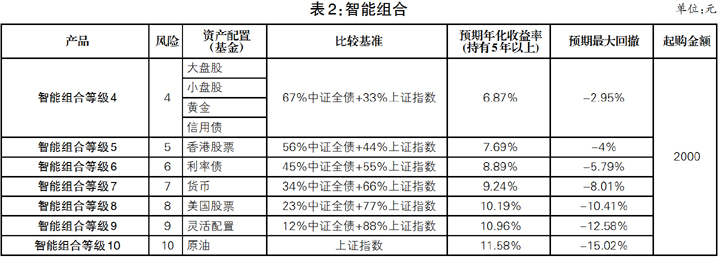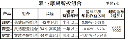 摩羯智投是招行专注公募基金的智能投资顾问,涵盖“摩羯组合、自助选基、聪明定投、基金诊断”等多个子模块。通过问卷对客户的投资时间、风险收益偏好、投资经验等进行了解,为其从以下三种组合中进行推荐:(表1)