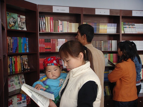 捧起一本书,就舍不得放下,那边书桌旁一个四五岁的小男孩正在爸爸的指引下“看图识字”,这边大嫂怀里抱着的孩子也看着书册上精美的图案“咿咿呀呀”。