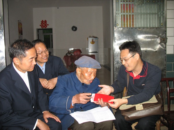 去年8月23日,株洲县太湖乡的抗战老兵颜帮仁满100岁。易伟仁和同伴们手捧鲜花,来到颜老家里,为他祝寿。老兵脸上绽开孩童般的笑容,“高兴!一辈子都没像今天这么高兴!”