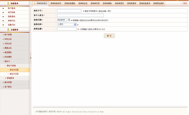 1.4 示例【商务卡报销信息登记】 1.5 注意事项 初次进行商务卡报销时,必须首先进行报销用途维护。 报销信息登记时,商务卡号(或持卡人姓名)及消费日期、金额必须与系统中信息一致,才可提交。 还款由系统当日日终批处理进行,次日可查询还款结果。 办理借记卡还款业务必须在签约时,指定借记卡账号。 2 报销查询 2.1 功能介绍 可进行商务卡报销业务处理过程中,各个环节的处理结果状态查询,以及消费明细、持卡人信息等信息查询。 2.2 操作流程 2.3 示例 消费明细查询: 报销信息查询: 报销单信息查询: 还款失败及退回信息查询: 持卡人信息查询: 操作员日志查询: 2.4 注意事项 在进行报销信息查询及持卡人信息查询时,“商务卡号”及“持卡人姓名”必输其一。 消费信息需在消费日次日进行查询。 还款失败及退回信息需在还款日次日进行查询。
