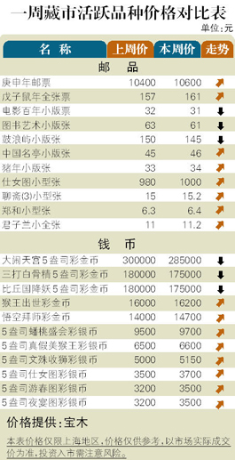 8月下旬,藏市略显变化,虽然成交没有实质性放大迹象,但部分热点品种的回升依然让人有种久旱遇甘霖的感觉。邮市:老邮中的庚申猴邮票回升到10600元,从小爱科学小型张上扬至12300元。而改革开放世博会无锡亚展双联小型张则分别下挫到41.5元、34.7元和31.9元。币市:前期弱势格局发生改变,盖因国际金价上扬推动。其中五台山”2盎司银币文殊菩萨价格攀升到2000元附近,京剧脸谱(3金银套币则扬升到5500元,京剧脸谱(3”5盎司银币则攀升到8200元。2012熊猫”1盎司金币和银币的价格分别回升至11400元和245元,熊猫发行30”1/4盎司银币上攀到380元左右。