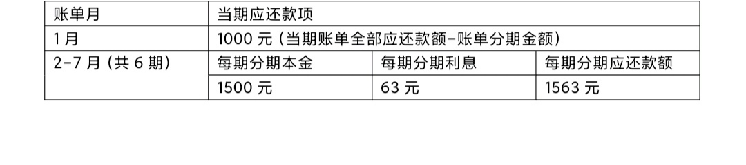 注:1.每期(月)分期利息=分期本金总额×每月分期利率,将在分期后的每个账单日按期入账并收取。
