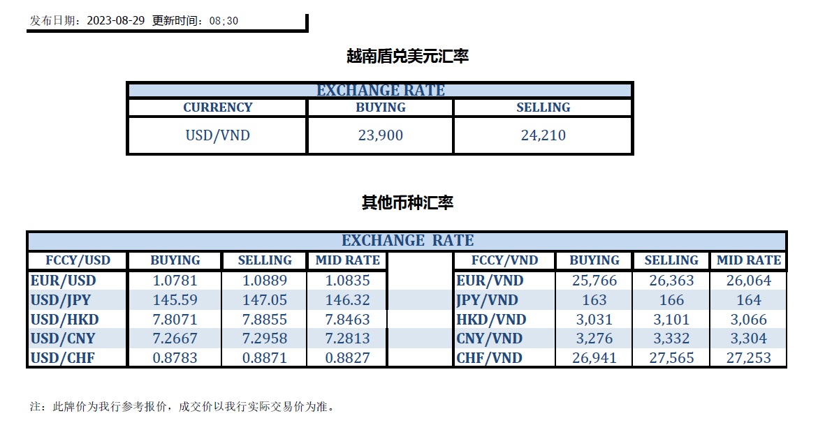 今日汇率 2023-08-29