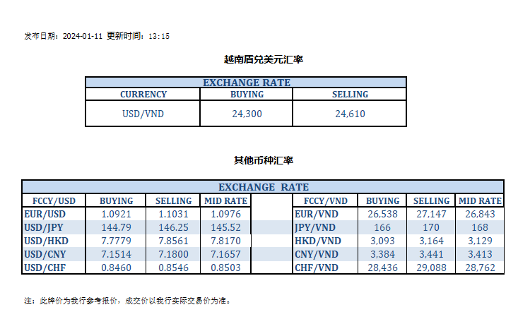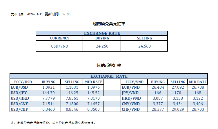 今日汇率 2024-01-11
