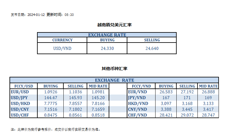 今日汇率 2024-01-12