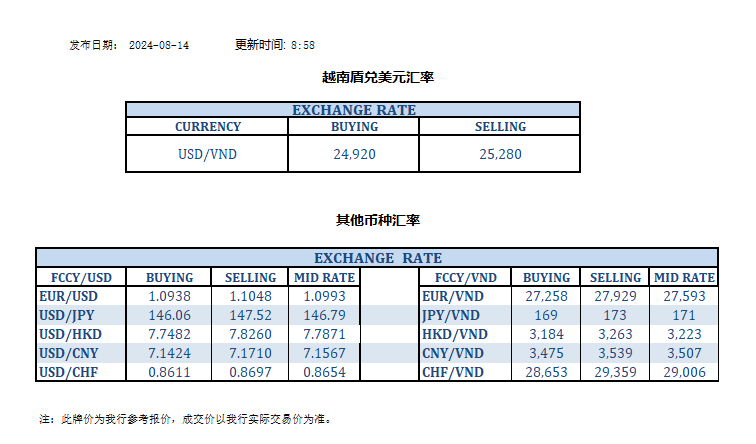 今日汇率 2024-08-14